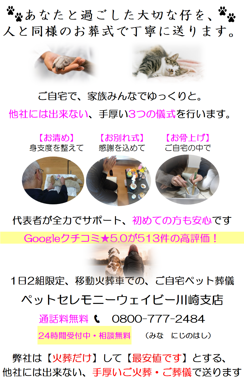 川崎市のペット火葬・ペット葬儀はクチコミ★5.0が500件超の高評価!ペットセレモニーウェイビー川崎支店